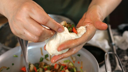 4. Múc một muỗng nhân mặn cho vào giữa miếng bột. Gói ghém phần nhân mặn thiệt khéo và thiệt tròn, nhưng đừng để chiếc bánh bị bể. Xem hình.