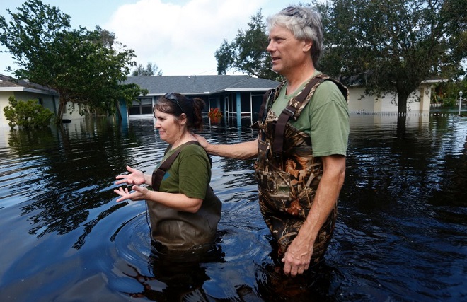 Người dân Mỹ đi bộ qua vùng nước ngập sâu ở Bonita Springs, Florida ngày 11.9