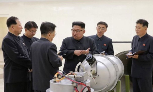 Nhà lãnh đạo Triều Tiên Kim Jong-un kiểm tra một thiết bị hạt nhân. Ảnh: KCNA.