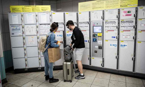 Hành khách đi tàu điện ngầm đang gửi hành lý ở tủ đồ tại ga Roppongi ở Tokyo vào ngày 4/9