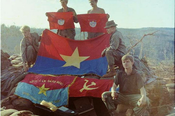 6.Lính Mỹ tịch thu cờ của Việt cộng sau một cuộc hành quân vào hang ổ Việt cộng và họ xem những thứ tịch thu được từ đối phương là chiến lợi phẩm của họ.