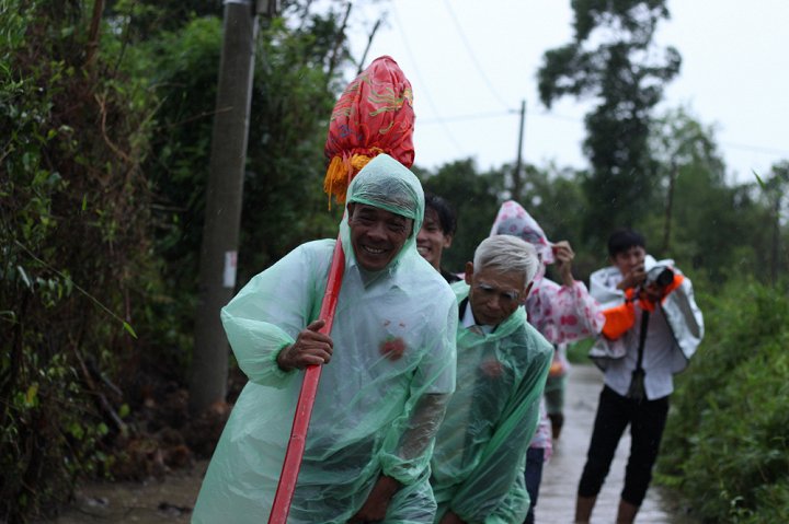 Bất chấp mưa bão, các thành viên nhà trai vẫn tiến vào tư dinh nhà gái. (Ảnh: Công Sáng)