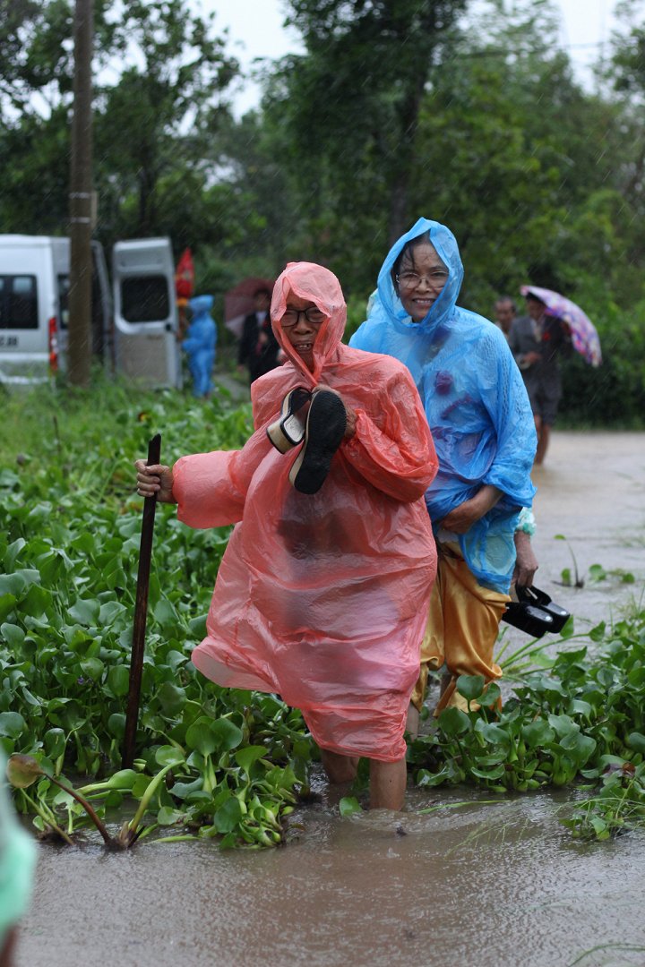 Đoàn bưng lễ nhà trai mặc áo mưa, lội bì bõm dưới nước bất chấp trời đang mưa và gió. (Ảnh: Công Sáng)