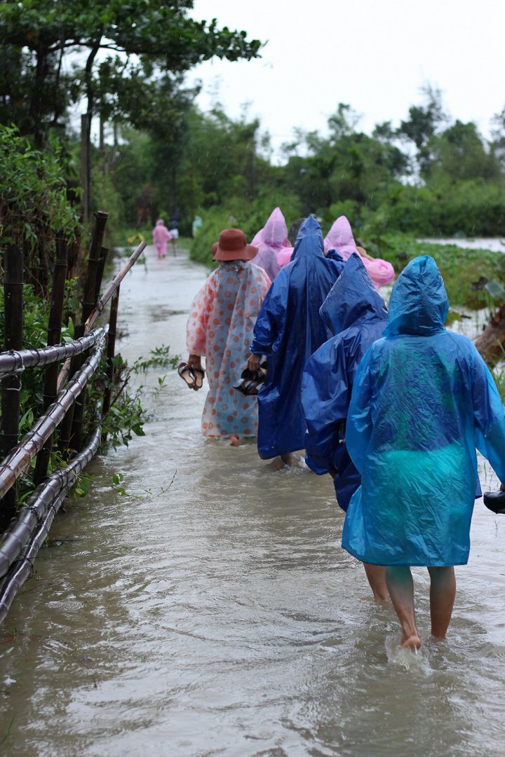 Theo chia sẻ từ anh Sáng, đoàn nhà trai phải cắp dép, xắn quần lội nước một quãng dài vì xe ô tô không thể vào tận nơi. Đặc biệt có những đoạn nước còn ngập cao hơn đầu gối, nhưng không khí rất vui vẻ vì sự kiện đặc biệt này.
