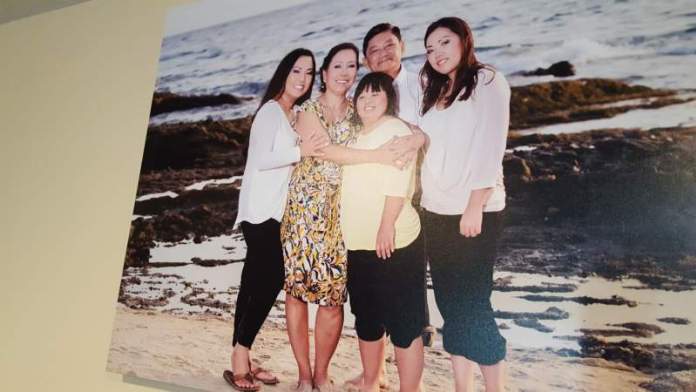 Hình chụp từ hình treo trong phòng khách, bà Helen, thứ nhì từ trái, trước khi bị ung thư máu. (Hình: Đằng-Giao/Người Việt)
