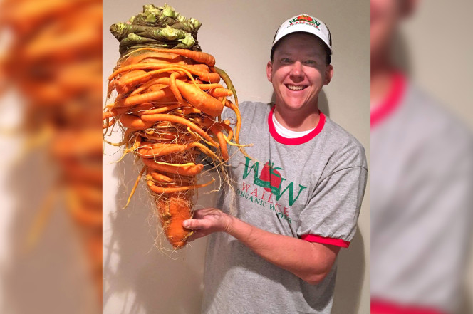 Chris Qualley, 34 tuổi, đã trồng được củ cà rốt khổng lồ với hình thù kỳ lạ trong vườn nhà anh tại bang Minnesota, Mỹ.