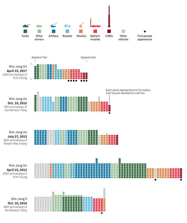 Trong cuộc duyệt binh ngày 15.4 năm nay, Triều Tiên trưng ra 8 tên lửa đạn đạo xuyên lục địa, 28 tên lửa đạn đạo tầm trung và 27 quả tên khác. Trong khi đó, chỉ có 17 xe tăng và 18 phương tiện pháo binh xuất hiện. Để so sánh, trong cuộc duyệt binh năm 2012 có sự xuất hiện của 102 xe tăng và 129 khẩu pháo.