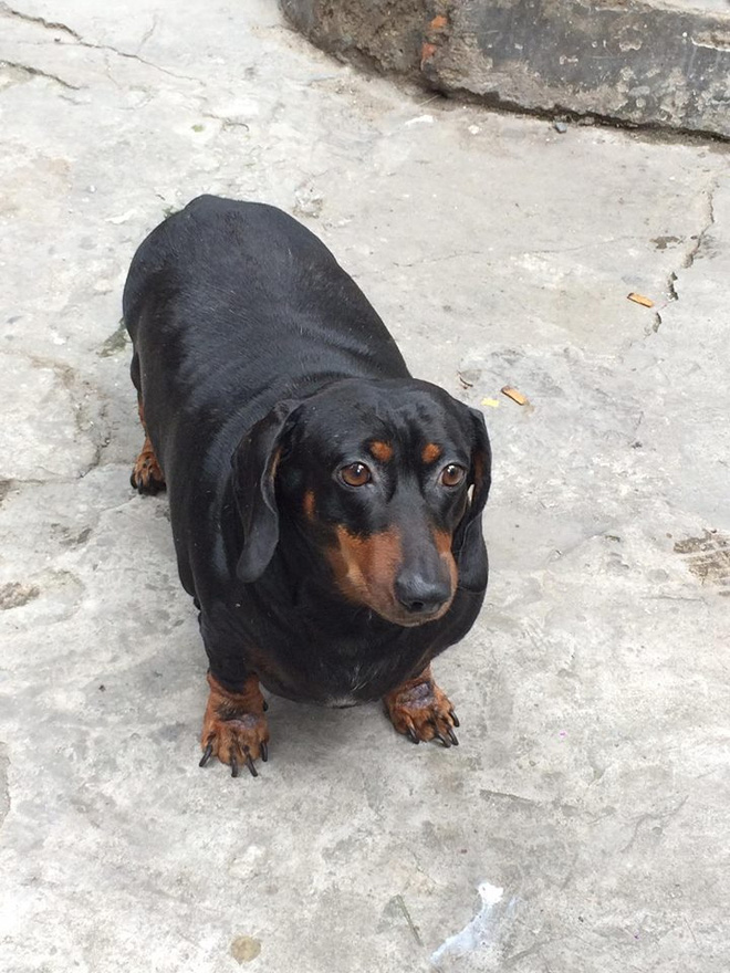 Vì quá béo nên chú chó dường như đi khá chậm chạm, bụng chạm gần tới đất, 4 chân thì cảm giác ngắn tũn.