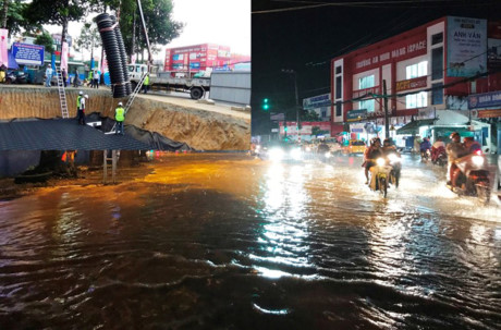 Hồ điều tiết chống ngập thông minh do Công ty Sekisui (Nhật Bản) và một đối tác Việt Nam đã thi công lắp đặt vào đầu tháng 8 vừa qua (ảnh nhỏ). Thế nhưng trong cơn mưa tối 18/9, tình trạng ngập nặng vẫn tái diễn.
