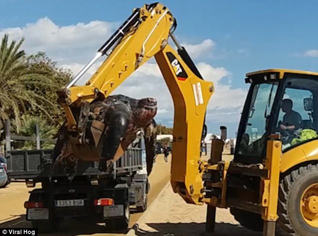Một con rùa khủng vừa dạt vào bãi biển Tây Ban Nha. Người ta đã phải dùng đến máy xúc để cứu nó, trả về tự nhiên. Rùa là con vật linh thiêng, sự xuất hiện của nó khiến mọi người bàn tán xôn xao.