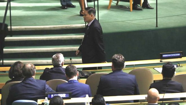 6.Dường như đã biết được Tổng thống Trump sẽ đề cập đến vấn đề gì trong phiên họp của Đại Hội đồng Liên Hợp Quốc. Trước khi Tổng thống Mỹ Donald Trump có mặt và phát biểu trước Đại Hội đồng. Đại diện phía Triều Tiên đã có phản ứng không mấy bất ngờ. Đại sứ Ja đã đến dự phiên họp của Đại Hội đồng nhưng rời phòng họp trước khi ông Trump đến. "Mỹ có sức mạnh và nhiều kiên nhẫn, nhưng nếu buộc phải bảo vệ chính mình cũng như bảo vệ các đồng minh, chúng tôi không còn sự lựa chọn nào khác là hủy diệt hoàn toàn Triều Tiên", tổng thống Mỹ tuyên bố trong bài phát biểu đầu tiên của ông trước Đại Hội đồng Liên Hợp Quốc.
