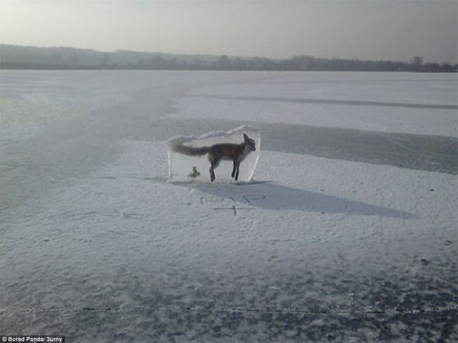 Cáo chết đuối dưới hồ đóng băng và được cắt lên để trưng bày như một cảnh báo mọi người tránh xa khu vực này.