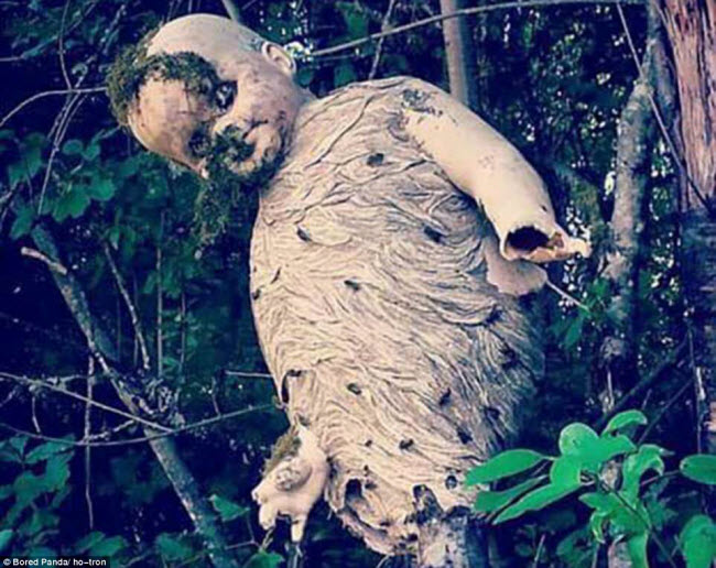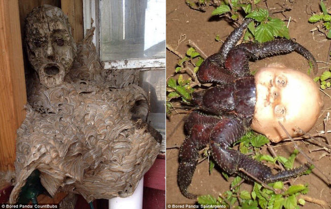 Ong bắp cày làm tổ quanh một bức tượng gỗ (trái), cua dùng đầu đầu búp bê làm tổ (phải).