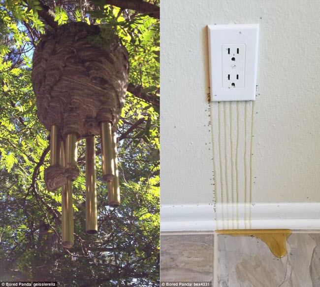 Ong làm tổ xung quanh chiếc chuông gió (trái), trong khi mật chảy ra từ tổ ong sau ổ điện (phải).