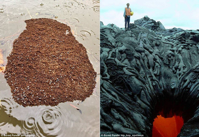 Kiến lửa kết lại với nhau để làm bè nổi trên mặt nước lũ ở Houston, Mỹ (trái), trong khi dung nham núi lửa tạo thành hình thù như những xác chết (phải).