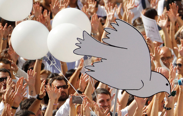 Trước đó vào ngày 7/10, hàng ngàn người cũng đã tụ tập tại Barcelona với đồ màu trắng nhằm kêu gọi hòa bình và thương lượng giữa Madrid và Catanolia (Ảnh: RT)