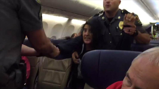 VBF-Cảnh sát Mỹ đã lôi một hành khách nữ xuống máy bay. Đoạn video còn ghi lại được hình ảnh này. Nhiều lần đã yêu cầu hành khách này xuống máy bay nhưng không chịu, nên đã phải dùng đến vũ lực.