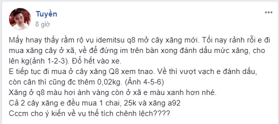 “Mấy hôm nay thấy rầm rộ vụ idemitsu q8 mở cây xăng mới. Tối nay rảnh rỗi em đi mua xăng ở xã, về để đứng im trên bàn xong đánh dấu mức xăng, cho lên kg (ảnh 1-2-3). Đổ hết vào xe.
