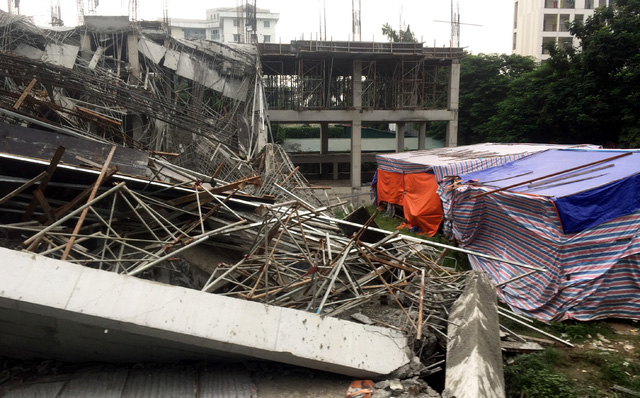 Cốt thép nghiêng ngả, giàn giáo bị đè bẹp, nhiều thanh dầm đứt gẫy.