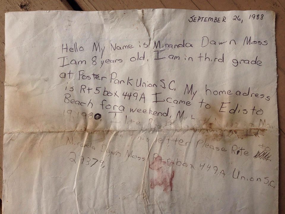 Miranda Chavez ném chai chứa bức thư ra khỏi bãi biển Edisto năm 1988. Giờ đây, một cặp vợ chồng ở Georgia đã nhặt được nó.