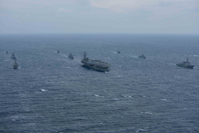 Hiện nay, nhóm tác chiến tàu sân bay do tàu USS Theodore Roosevelt dẫn đầu cùng đội tàu hộ tống gồm 3 khu trục hạm USS Halsey, USS Sampson, USS Preble và tuần dương hạm USS Bunker Hill, với tổng cộng khoảng 7.500 quân nhân, đang ở gần Hawaii. Nhóm tàu này rời cảng nhà ở thành phố San Diego (bang California) hôm 6.10 và theo lịch trình sẽ đến Tây Thái Bình Dương vào lúc Tổng thống Trump đang ở thăm Tokyo hoặc Seoul. Còn nhóm tác chiến tàu sân bay USS Ronald Reagan, với khoảng 7.500 người, đang hoạt động cách bờ biển Hàn Quốc 160 km về phía đông và có thể lưu lại ở khu vực cho đến khi Tổng thống Trump thăm Hàn Quốc vào ngày 7 - 8.11. Nhóm tàu USS Ronald Reagan đã tham gia cuộc tập trận hải quân Hàn - Mỹ ở vùng biển nằm giữa bán đảo Triều Tiên và Nhật Bản từ ngày 16 - 20.10. Điểm khác thường trong cuộc tập trận này so với những đợt huấn luyện trước là các chiến đấu cơ F/A-18 cất cánh từ tàu sân bay USS Ronald Reagan được gắn vũ khí thật trên cánh, theo Nikkei Asian Review. Chỉ huy tàu sân bay Buzz Donnelly cho biết thêm từ vị trí hoạt động hiện nay của USS Ronald Reagan, các chiến đấu cơ với tầm bay 965 km có khả năng tấn công hầu hết mọi mục tiêu trên bán đảo Triều Tiên.
