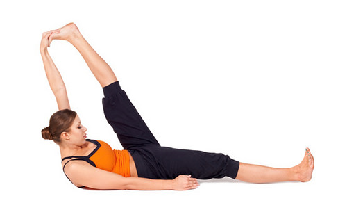 - Động tác 2: Hít vào, co chân phải lên, tay phải nắm chặt ngón chân cái bên phải. Đồng thời đặt bàn tay trái lên bắp đùi trái để ổn định chân trái.