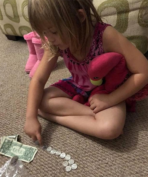 Hồi đầu tháng 10, cô bé bất ngờ dốc hết tiền trong heo tiết kiệm ra sàn nhà và ngồi đếm. Ban đầu bà ngoại Jackie Oelfke tưởng cháu mình tự bày trò chơi đùa nhưng sau đó thấy tò mò khi Sunshine cẩn thận cho số tiền vào một chiếc túi nhựa và đặt nó cạnh cặp sách.