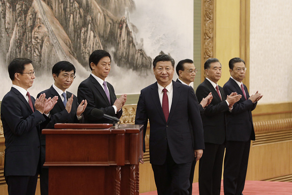 Tập Cận B́nh, giữa, và sáu thành viên trong Ủy Ban Thường Vụ Bộ Chính Trị được giới thiệu tại Đại Sảnh Nhân Dân ở Bắc Kinh ngày thứ Tư, 25 tháng 10, 2017. (Getty Images)