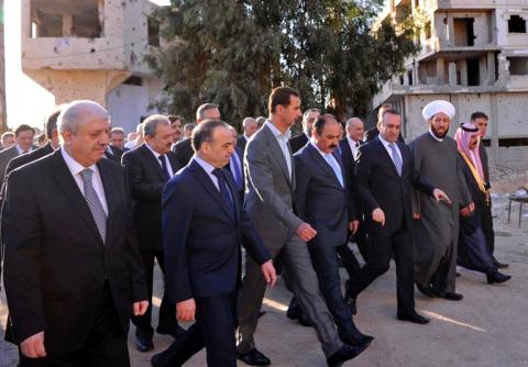 Tổng thống Syria Bashar al-Assad thị sát một khu vực tại Daraya sau khi được giải phóng khỏi tay lực lượng đối lập