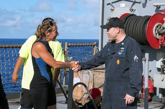 Tuy nhiên, từ cuối tháng 5, chiếc thuyền chở Appel và Tasha bắt đầu gặp trục trặc về động cơ do thời tiết xấu. Ngày 30/5, một cơn bão ập tới khiến động cơ của thuyền bị hỏng. Hệ thống thông tin liên lạc cũng không hoạt động được. Kể từ đó, hai người phụ nữ cùng hai con chó của mình phải tìm cách để sống sót trở về đất liền. Trong ảnh: Jennifer Appel bắt tay chỉ huy tàu USS Ashland khi được giải cứu thành công khỏi thuyền gặp nạn (Ảnh: US Navy)