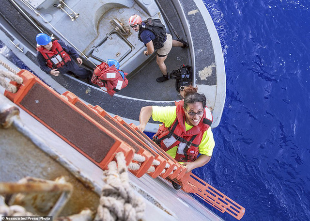 Hải quân Mỹ cho biết trước khi lên thuyền và gặp nạn ở Thái Bình Dương, Appel và Tasha đã chuẩn bị đầy đủ thực phẩm để sử dụng trong vòng một năm, trong đó chủ yếu là thức ăn khô như gạo, mỳ ống và yến mạch. Họ cũng mang theo các máy lọc nước và đây là những yếu tố giúp Appel và Tasha sống suốt trong suốt 5 tháng trên biển. Trong ảnh: Tasha Fuiaba trèo thang lên tàu USS Ashland sau khi được giải cứu. (Ảnh: AP)
