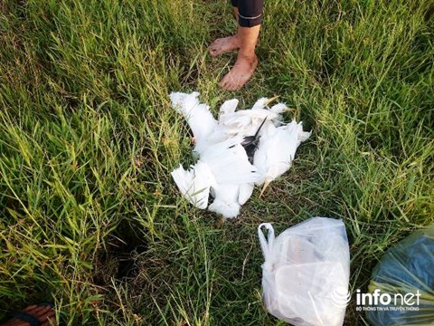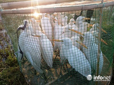 Quan sát của PV thấy, xung quanh khu vực bẫy chim đều được trải lưới và dùng chim giả làm bằng xốp hoặc những xốp hộp đựng thức ăn bẻ đôi cắm trên đồng ruộng. Đặc biệt, có khoảng 20 con cò trắng bị buộc dây ở chân làm “chim mồi” được 2 bố con gom lại thành một lồng.