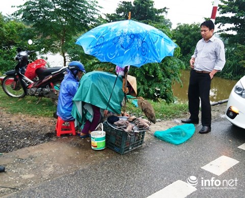 Dọc QL1A, đoạn qua cánh đồng Thanh Lam (thuộc phường Thủy Phương, thị xã Hương Thủy) có 2 nhóm người dân địa phương đang tấp nập giao bán cho người đi đường cả chim đã chết và chim sống.