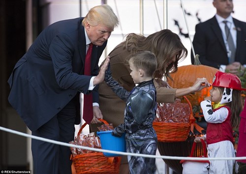 Không khí lễ hội Halloween vui mừng, sôi nổi tại Nhà Trắng. Tổng thống Trump và đệ nhất phu nhân Melania bắt tay và phát kẹo cho trẻ em, chụp ảnh với hàng ngàn trẻ em đi qua cổng Nhà Trắng.