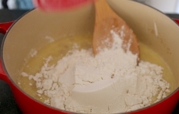 4. Mở nắp. Cho một chén rưỡi bột vào nồi gang. Sử dụng muỗng gỗ (hoặc muỗng xới cơm) trộn bột với hỗn hợp sữa + bơ + đường. Trộn không ngừng tay trong ṿng một phút. Trộn cho tới khi bột bắt đầu dính và nặng tay.