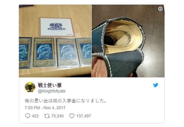Chi tiết khiến cả Twitter cảm phục người cha này chính là: @knightMiyabi phải rất khó khăn mới có thể ra quyết định bán những lá bài Rồng Trắng Mắt Xanh quý giá. Khi con gái đang ngồi chơi bài của bố, cô bé bật khóc khi chúng bị lấy khỏi tay. Ông bố trẻ dường như đã nhận ra hình ảnh của chính mình, anh quyết định bán đi kỷ niệm và đam mê của mình vì mục đích lớn lao hơn.