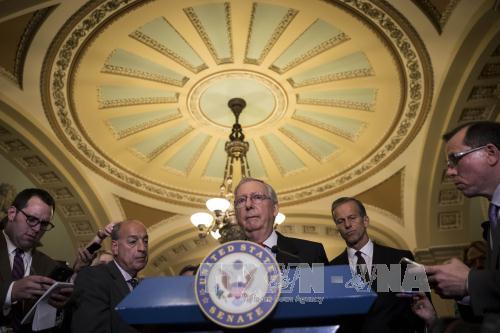Lãnh đạo đa số Thượng viện Mỹ Mitch McConnell (giữa) phát biểu trong cuộc họp báo tại thủ đô Washington ngày 24/10.
