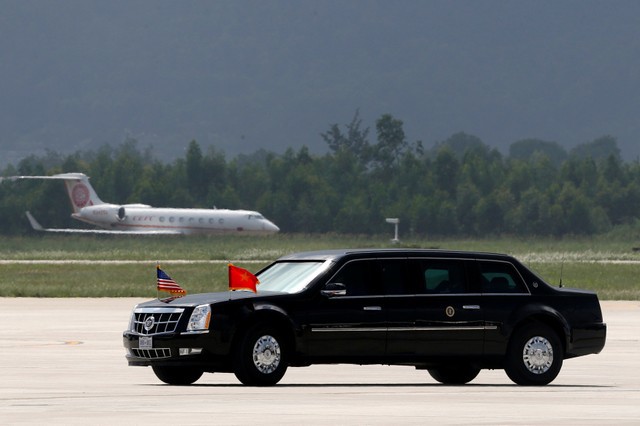 Kết thúc các hoạt động tại Đà Nẵng, Tổng thống Donald Trump sẽ tới Hà Nội thăm cấp Nhà nước theo lời mời của Chủ tịch nước Trần Đại Quang, từ ngày 11-12/11. Trong ảnh: Chiếc limousine của Tổng thống Mỹ tại sân bay Đà Nẵng. (Ảnh: Reuters)
