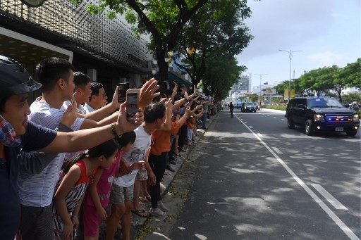 Người dân háo hức chiêm ngưỡng đoàn xe chở Tổng thống Mỹ lăn bánh trên đường phố Đà Nẵng. (Ảnh: AFP)
