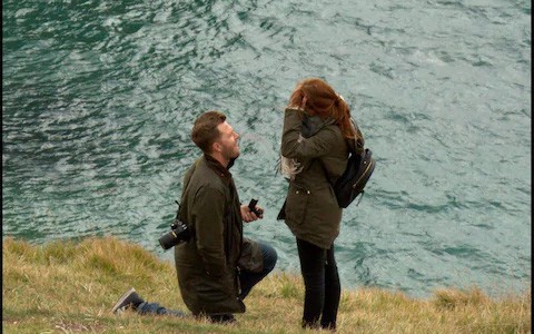 Khoảnh khắc tuyệt đẹp và riêng tư của một cặp đôi được ghi lại cho thấy người bạn trai với gương mặt rạng rỡ hạnh phúc đang quỳ xuống cầu hôn bạn gái của mình ngay trước khung cảnh thiên nhiên hùng vỹ của vòm đá vôi Durdle Door nổi tiếng tại Dorset, Anh.