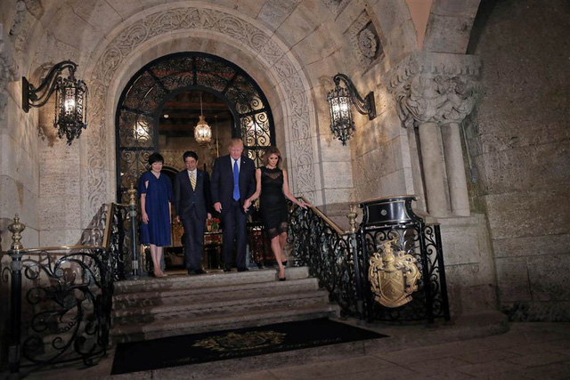 Tổng thống Trump và Đệ nhất phu nhân Melania tiếp Thủ tướng Nhật Bản Shinzo Abe và phu nhân Akie Abe trong bữa tiệc tối tại khu nghỉ dưỡng Mar-a-Lago của nhà lãnh đạo Mỹ ở Palm Beach, bang Florida ngày 11/2. (Ảnh: Reuters)