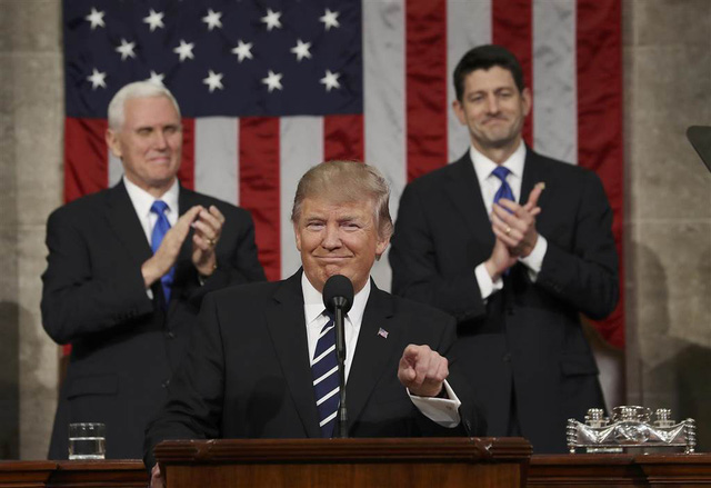 Tổng thống Trump phát biểu lần đầu tiên trong phiên họp của Quốc hội Mỹ ngày 28/2. Phía sau ông là Phó Tổng thống Mike Pence (trái) và Chủ tịch Hạ viện Paul Ryan. (Ảnh: Reuters)