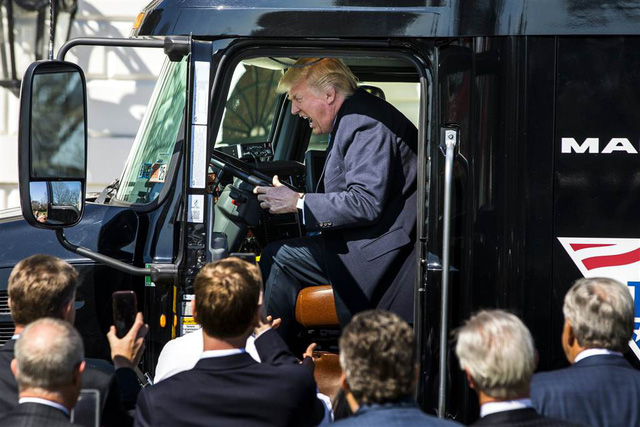 Ông Trump ngồi trên ghế lái trong cuộc gặp mặt các tài xế xe tải và lãnh đạo của các công ty sản xuất xe tải hôm 23/3 tại Nhà Trắng. (Ảnh: EPA)