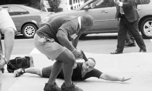 Ngay lập tức, hai điều diễn ra gần như đồng thời: một sĩ quan tình báo của sở cảnh sát New York nhảy ra khỏi chiếc xe dẫn đầu đoàn hộ tống và rút khẩu súng lục Glock, trong khi một người đàn ông vạm vỡ mặc áo phông, quần đùi lôi khẩu SIG-Sauer P229 chuyên dụng của mật vụ Mỹ ra và hét lớn "Nằm xuống đất! Nằm xuống". Người đàn ông đô con này là một thành viên đội chống trinh sát của Cơ quan Mật vụ đang cải trang trong đám đông. Anh này buộc phải làm lộ vỏ bọc của mình để ngăn chặn mối đe dọa tiềm tàng.