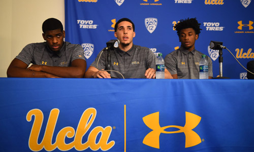 Ba cầu thủ Cody Riley, LiAngelo Ball và Jalen Hill (trái sang) trong buổi họp báo ngày 15/11. Ảnh: Daily News.