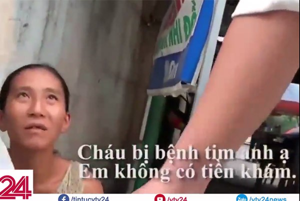 Theo đó, khoảng 9h, tại khu vực bệnh viện Nhi Đồng 2 (TP.HCM), sau khi thay bộ đồ nhem nhuốc, vừa hút thuốc lá, người phụ nữ vừa dùng gạc y tế quấn quanh cổ tay như bị thương, rồi bế đứa bé ngồi ngay lối ra vào giữa bãi giữ xe để xin tiền những người xung quanh. Khi có người tới hỏi về sức khỏe đứa nhỏ đang ngủ li bì, người phụ nữ này trả lời: "Bé bị tim. Không có tiền đi khám". Và chỉ chưa đầy 2 giờ, số tiền mà người phụ nữ này xin được là khoảng 200.000 đồng.