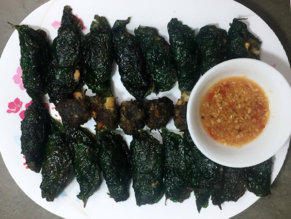 - Để lá lốt to lên lòng bàn tay, dùng thìa nhỏ múc lượng vừa phần chả vào giữa lá lốt rồi nhẹ nhàng gấp hai mép lại. Làm lần lượt cho đến hết. Nếu không muốn bọc bằng lá lốt bên ngoài, bạn có thể vo tròn hỗn hợp chả ốc thành những viên vừa ăn cũng được.