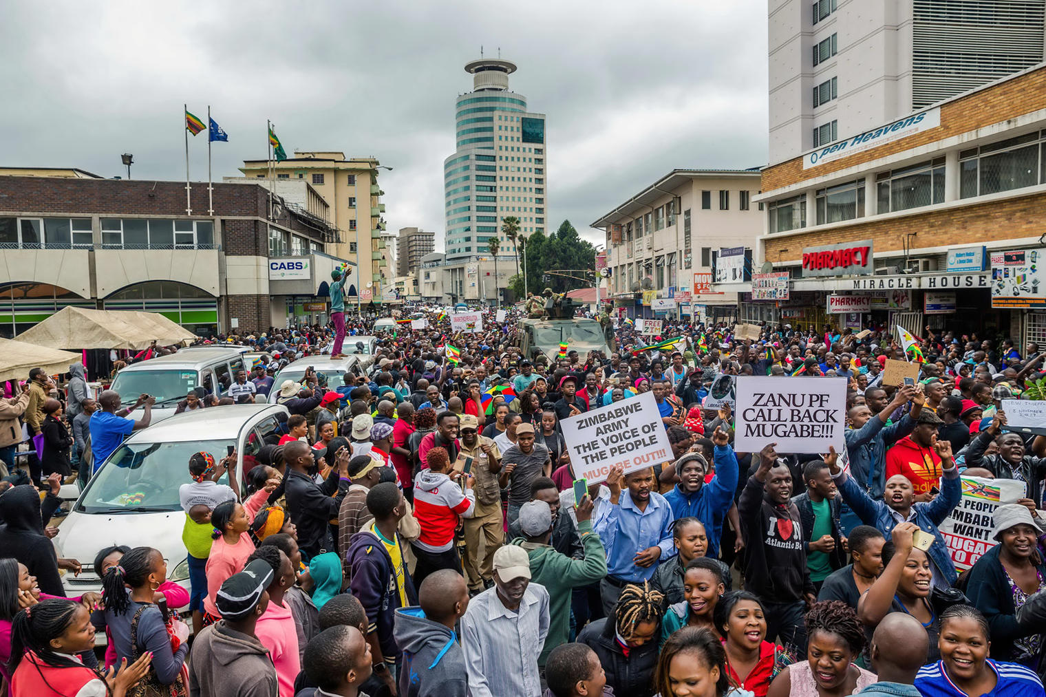 Đám đông vừa hát hò, nhảy múa vừa giơ cao các biểu ngữ “Mugabe phải từ chức” hoặc “Nói không với triều đại Mugabe”, theo Reuters. Nhiều người thậm chí chạy đến ôm các binh sĩ đang tuần tra trên đường phố và đồng thanh hét lớn: “Cảm ơn”.