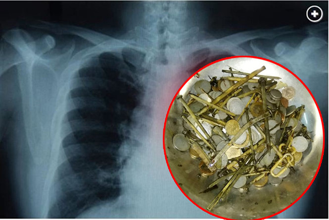 Mới đây các bác sĩ tại Ấn Độ đã không khỏi bàng hoàng khi tiếp nhận 1 ca đau bụng quằn quại. Sau khi khẩn trường tiên hành thăm khám và nội soi bác sĩ đã biết chính xác nguyên nhân khiến nam thanh niên này bị đau bùng là vì gì. Sau đó các bác sĩ đã phải thực hiện phẫu thuật và gắp ra rất nhiều các đồng xu và ốc vít...Anh chàng 35 tuổi người Ấn Độ nuốt đến 7kg kim loại vào bụng đã khiến các bác sĩ phát hoảng khi phẫu thuật lấy ra 263 đồng xu, hàng chục lưỡi lam và cả trăm... móng tay, theo Metro.