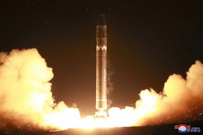 Tên lửa Hwasong-15 rời bệ phóng. (Ảnh: Yonhap)